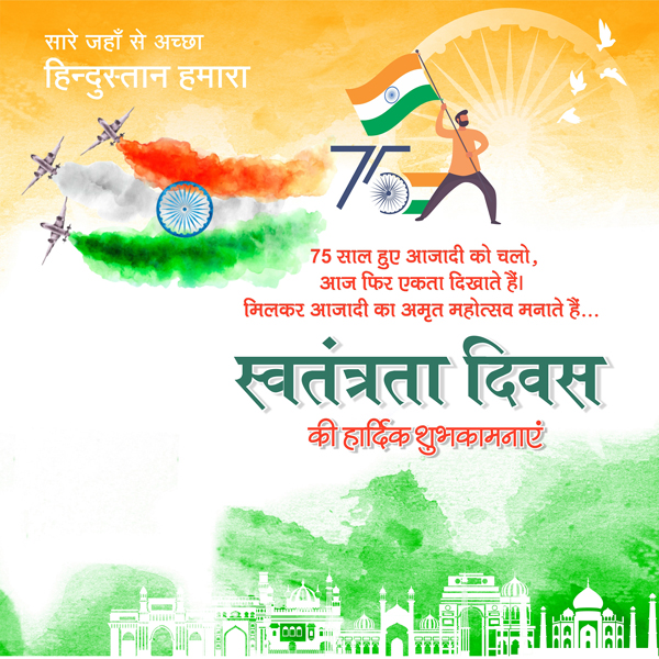 “आन देश की शान देश की, देश की हम संतान हैं, तीन रंगों से रंगा तिरंगा, अपनी ये पहचान है। स्वतंत्रता दिवस की हार्दिक शुभकामनाएं"