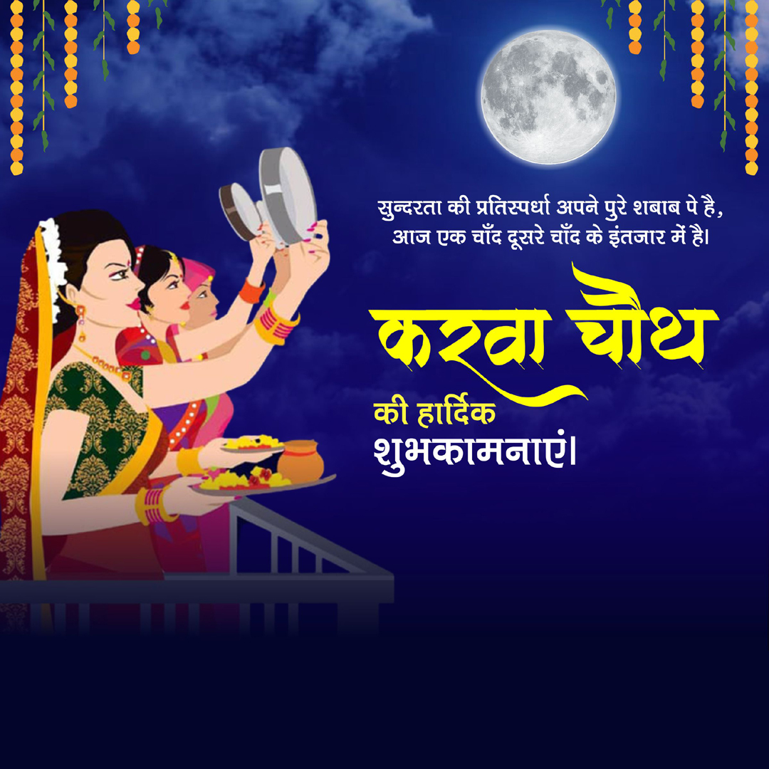 "धन्य वह देवी जो पति सुख हेतु व्रत पावे, धन्य वह पति देवी रूप पत्नी पावे, धन्य वह स्वरूप जो मनुष्यता का दीप जलावे। करवा चौथ की हार्दिक शुभकामनाएं।"